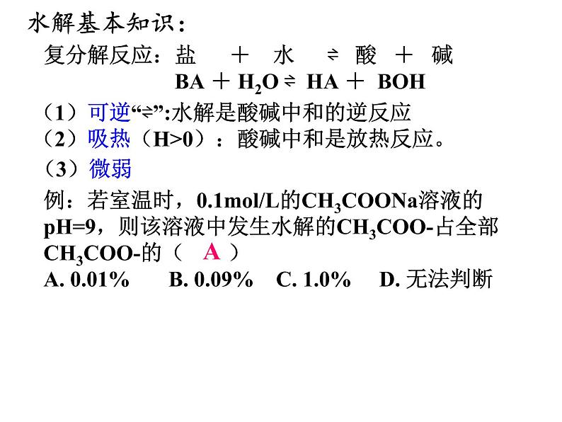 复分解反应:盐 + 水 ⇌ 酸 + 碱 BA + H2O ⇌ HA + BOH