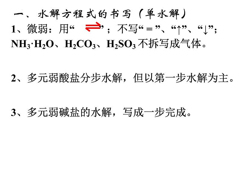 1、微弱:用“ ” ;不写“ = ”、“↑”、“↓”;NH3·H2O、H2CO3、H2SO3 不拆写成气体。2、多元弱酸盐分步水解,但以第一步水解为主。3、多元弱碱盐的水解,写成一步完成。