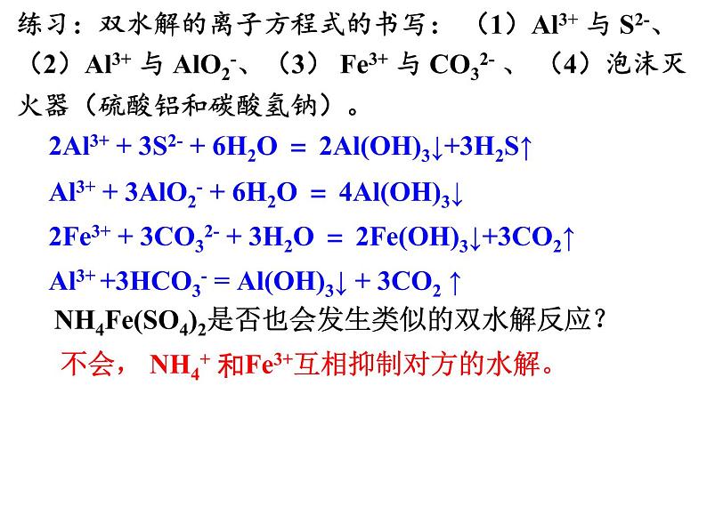 练习:双水解的离子方程式的书写: (1)Al3+ 与 S2-、 (2)Al3+ 与 AlO2-、(3) Fe3+ 与 CO32- 、 (4)泡沫灭火器(硫酸铝和碳酸氢钠)。
