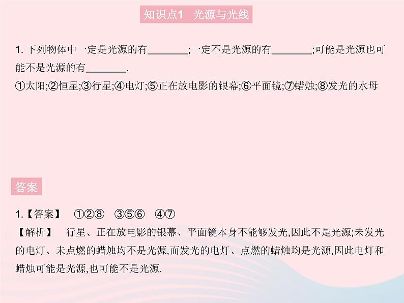 1.【答案】 ①②⑧ ③⑤⑥ ④⑦【解析】 行星、正在放电影的银幕、平面镜本身不能够发光,因此不是光源;未发光的电灯、未点燃的蜡烛均不是光源,而发光的电灯、点燃的蜡烛均是光源,因此电灯和蜡烛可能是光源,也可能不是光源.