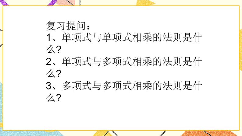 学生回答法则内容,并举例进行说明。 (1)单项式相乘,把它的系数、相同字母分别相乘,对于只在一个单项式里含有的字母,则连同它的指数作为积的一个因式 (2)单项式与多项式相乘,就是用单项式与去乘多项式的每一项,再把所得的积相加 (3)多项式与多项式相乘,先用一个多项式的每一项乘以另一个多项式的每一项,再把所得的积相加.
