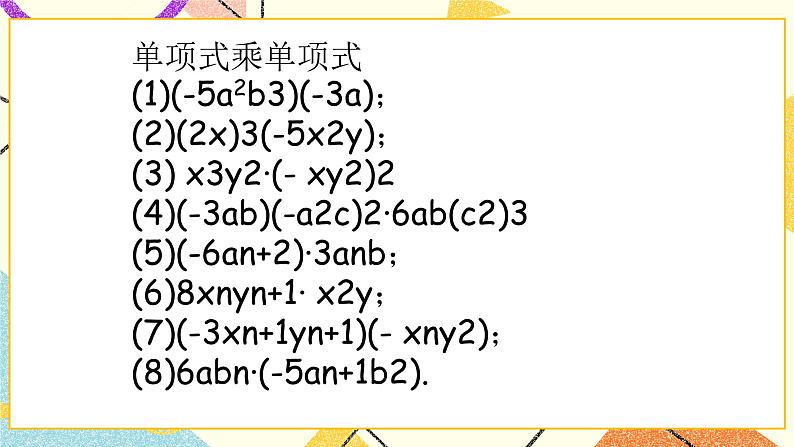 二、 练习(多媒体出示) (一) 单项式乘单项式 学生在练习本上独立完成(单数排做1、3、5、7;双数排做2、4、6、8,然后由学生订正答案)