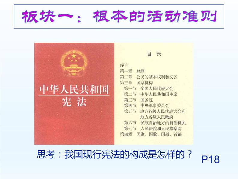 这是一份政治 (道德与法治)人教部编版第一单元 坚持宪法至上第二课 保障宪法实施坚持依宪治国课文内容ppt课件,共33页。PPT课件主要包含了导入新课,教学目标,自学导航,运用经验,给我们什么启示,宪法构成,核心内容,我国宪法的构成,问题探究,探究分享等内容,欢迎下载使用。