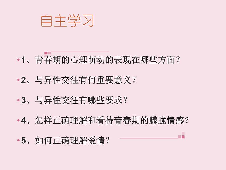 1、青春期的心理萌动的表现在哪些方面?2、与异性交往有何重要意义?3、与异性交往有哪些要求?4、怎样正确理解和看待青春期的朦胧情感?5、如何正确理解爱情?