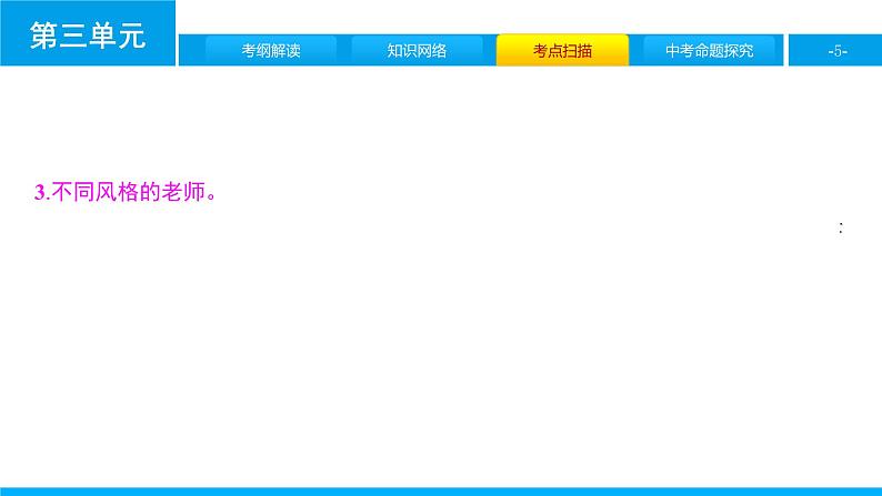 3.不同风格的老师。( 1 )产生原因:由于年龄、学识、阅历、性格、情感与思维方式等差异,每位老师解决问题的方法和表达方式不同。( 2 )如何对待:①我们要承认老师之间的差异,接纳每位老师的不同,他们身上都有值得我们学习的地方。②无论什么风格的老师都应该受到尊重。尊重老师的“不同”,可以让我们走近老师,更深入地了解老师。