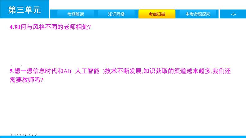 4.如何与风格不同的老师相处?( 1 )承认老师的差别。( 2 )发现不同风格老师的优点。( 3 )了解老师教育行为的目的。( 4 )主动交往。5.想一想信息时代和AI( 人工智能 )技术不断发展,知识获取的渠道越来越多,我们还需要教师吗?( 1 )信息时代,我们可以通过很多途径获得知识。但是,教给我们思考的方法、激发我们探求知识的欲望的只能是教师。( 2 )教师不仅仅是我们知识学习的指导者,也是我们精神成长的引路人。教师的巨大力量在于作出榜样。( 3 )教师是人类文明的传播者,是人类灵魂的工程师,在我们成长过程中发挥着不可替代的作用。