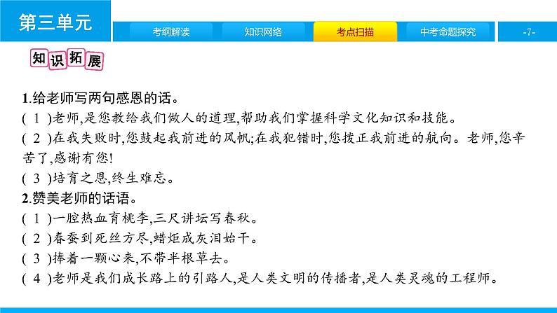 考点纵横本单元考点:“师长情谊”分别讲述了中学生应正确认识师生关系、家庭关系,引导我们培养尊师敬师、孝敬父母的中华传统美德。链接考点:[九年级上册第三单元考点一]“守望精神家园”中讲到“传承和弘扬中华传统美德”,引导我们认识美德、传承美德、践行美德。( 见P104 )