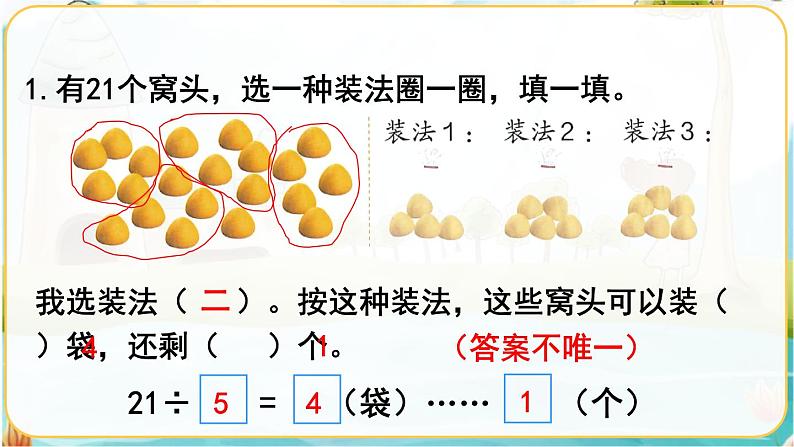 展开1.有21个窝头,选一种装法圈一圈,填一填。