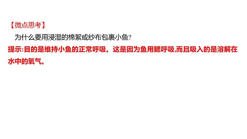 【微点思考】 为什么要用浸湿的棉絮或纱布包裹小鱼?提示:目的是维持小鱼的正常呼吸。这是因为鱼用鳃呼吸,而且吸入的是溶解在水中的氧气。