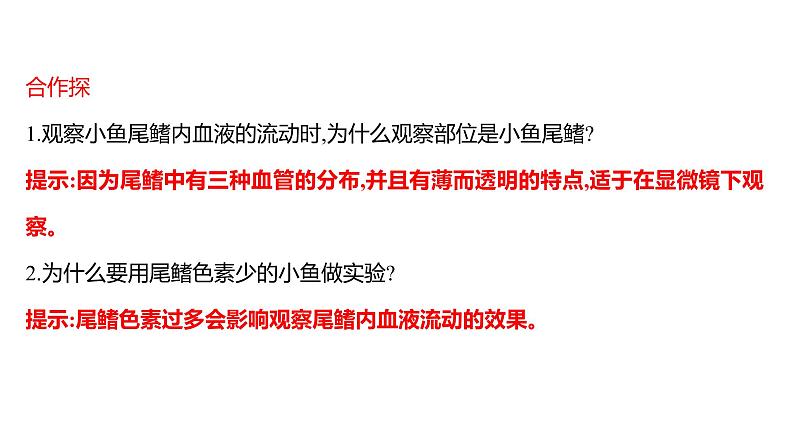 合作探1.观察小鱼尾鳍内血液的流动时,为什么观察部位是小鱼尾鳍?提示:因为尾鳍中有三种血管的分布,并且有薄而透明的特点,适于在显微镜下观察。2.为什么要用尾鳍色素少的小鱼做实验?提示:尾鳍色素过多会影响观察尾鳍内血液流动的效果。