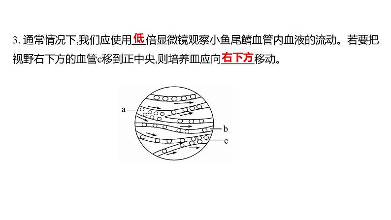 3. 通常情况下,我们应使用___倍显微镜观察小鱼尾鳍血管内血液的流动。若要把视野右下方的血管c移到正中央,则培养皿应向_______移动。