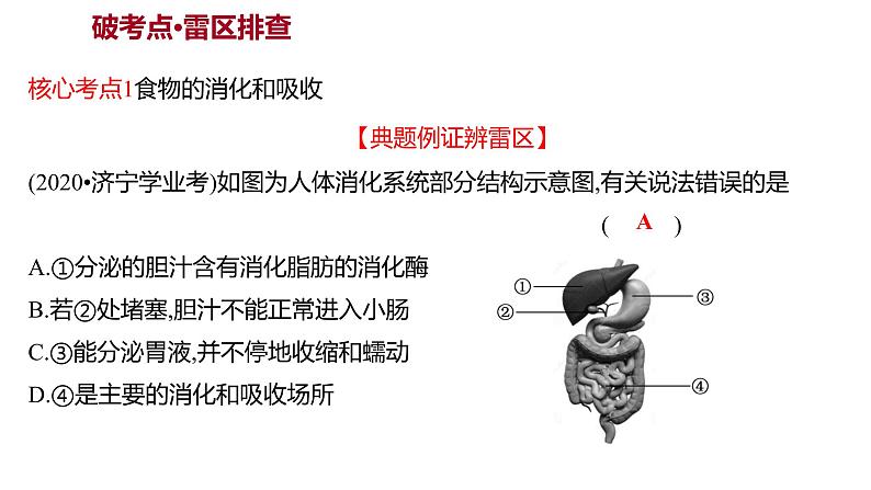 核心考点1食物的消化和吸收【典题例证辨雷区】(2020•济宁学业考)如图为人体消化系统部分结构示意图,有关说法错误的是 ( )A.①分泌的胆汁含有消化脂肪的消化酶B.若②处堵塞,胆汁不能正常进入小肠C.③能分泌胃液,并不停地收缩和蠕动D.④是主要的消化和吸收场所