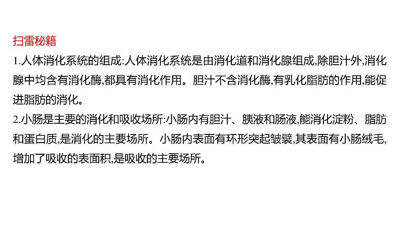 扫雷秘籍1.人体消化系统的组成:人体消化系统是由消化道和消化腺组成,除胆汁外,消化腺中均含有消化酶,都具有消化作用。胆汁不含消化酶,有乳化脂肪的作用,能促进脂肪的消化。2.小肠是主要的消化和吸收场所:小肠内有胆汁、胰液和肠液,能消化淀粉、脂肪和蛋白质,是消化的主要场所。小肠内表面有环形突起皱襞,其表面有小肠绒毛,增加了吸收的表面积,是吸收的主要场所。