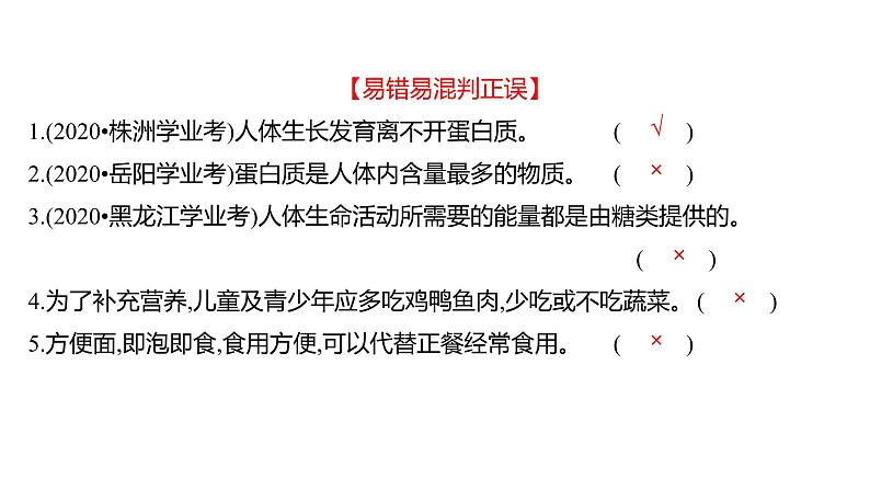 【易错易混判正误】1.(2020•株洲学业考)人体生长发育离不开蛋白质。( )2.(2020•岳阳学业考)蛋白质是人体内含量最多的物质。( )3.(2020•黑龙江学业考)人体生命活动所需要的能量都是由糖类提供的。 ( )4.为了补充营养,儿童及青少年应多吃鸡鸭鱼肉,少吃或不吃蔬菜。( )5.方便面,即泡即食,食用方便,可以代替正餐经常食用。( )