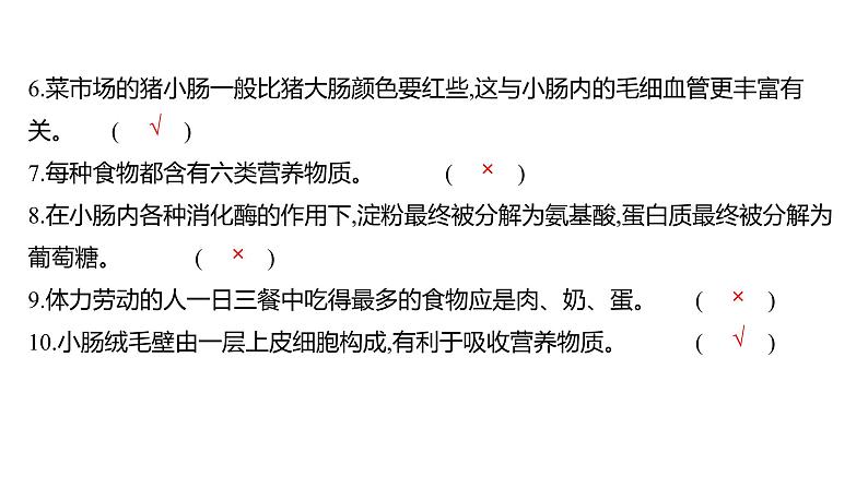 6.菜市场的猪小肠一般比猪大肠颜色要红些,这与小肠内的毛细血管更丰富有关。( )7.每种食物都含有六类营养物质。( )8.在小肠内各种消化酶的作用下,淀粉最终被分解为氨基酸,蛋白质最终被分解为葡萄糖。( )9.体力劳动的人一日三餐中吃得最多的食物应是肉、奶、蛋。( )10.小肠绒毛壁由一层上皮细胞构成,有利于吸收营养物质。( )