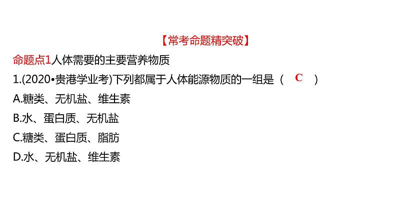 【常考命题精突破】命题点1人体需要的主要营养物质1.(2020•贵港学业考)下列都属于人体能源物质的一组是( )A.糖类、无机盐、维生素B.水、蛋白质、无机盐C.糖类、蛋白质、脂肪D.水、无机盐、维生素