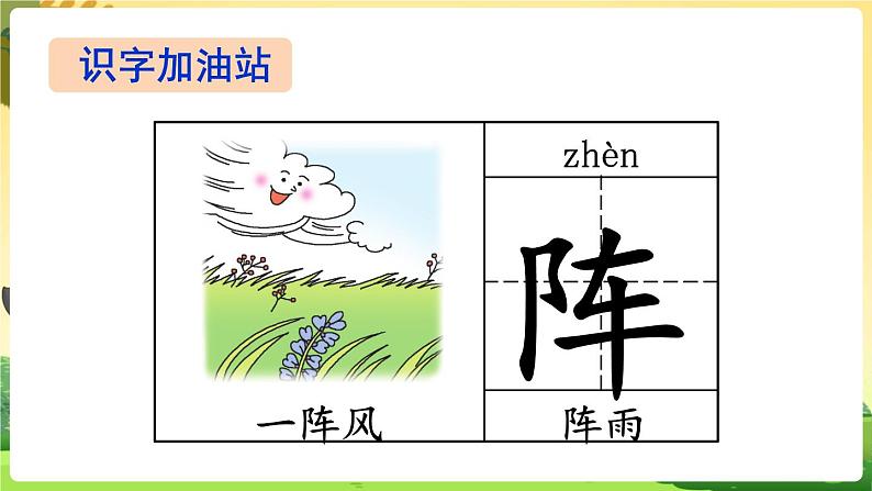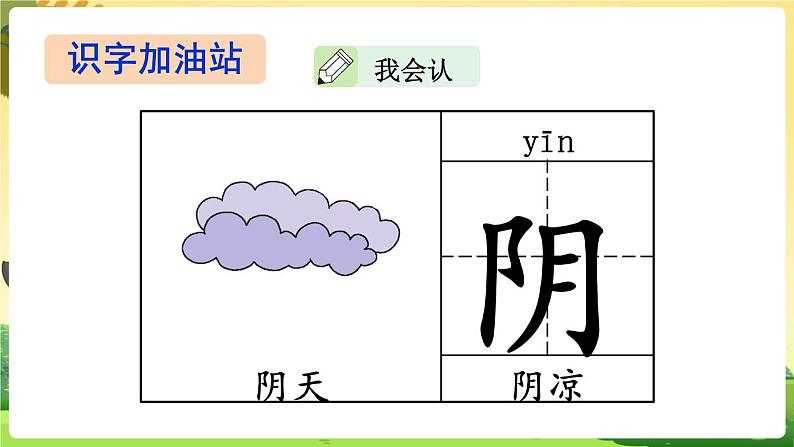 这些词语都和天气有关,常常出现在天气预报中。“阴”“阵”是前鼻音,“冰”“冻”是后鼻音,并且偏旁都是两点水。