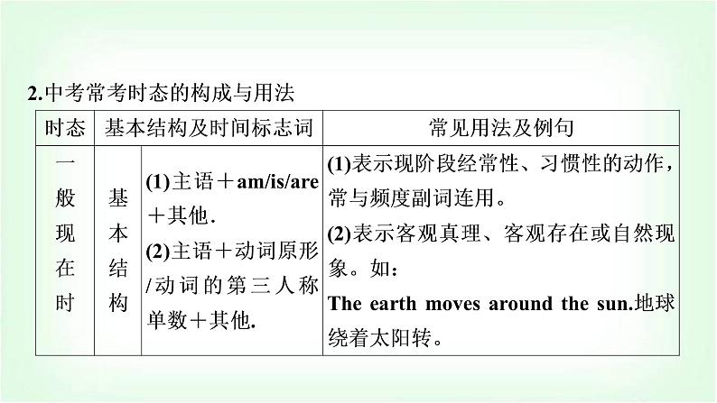 这是一份人教版中考英语复习专题突破十动词的时态和语态教学课件,共60页。PPT课件主要包含了caught,is held,cleaned,arrives,was held等内容,欢迎下载使用。
