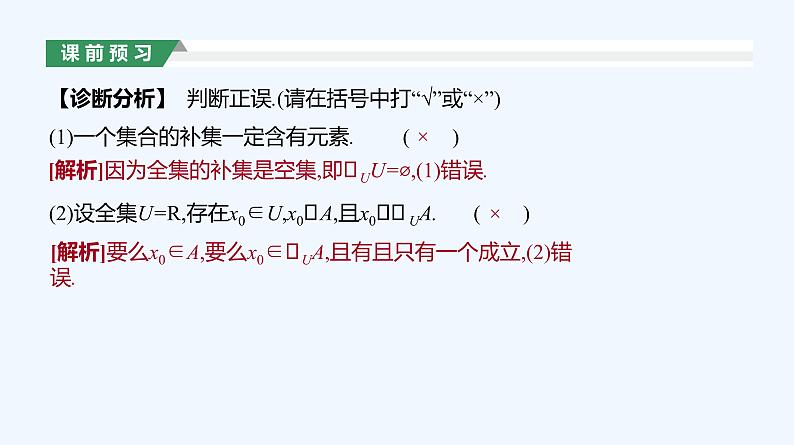 【诊断分析】 判断正误.(请在括号中打“√”或“×”)(1)一个集合的补集一定含有元素.( )(2)设全集U=R,存在x0∈U,x0∉A,且x0∉∁UA.( )