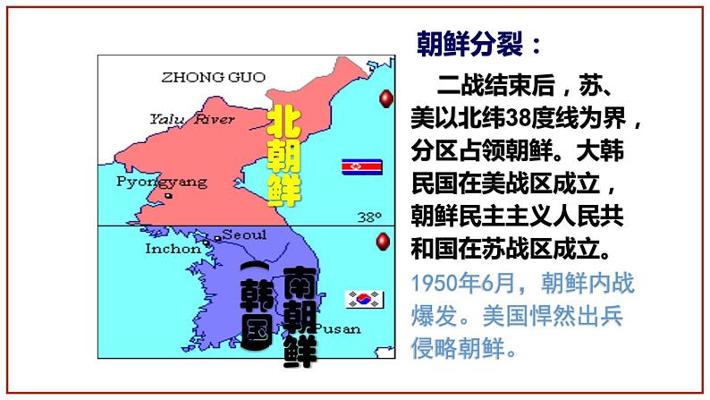 这是一份初中历史人教部编版八年级下册第2课 抗美援朝课文内容ppt课件,共30页。PPT课件主要包含了历史背景,北朝鲜,南朝鲜韩国,仁川登陆,抗美援朝该不该,醉翁之意不在酒,唇亡齿寒,户破堂危,必须出兵,中国人民志愿军等内容,欢迎下载使用。
