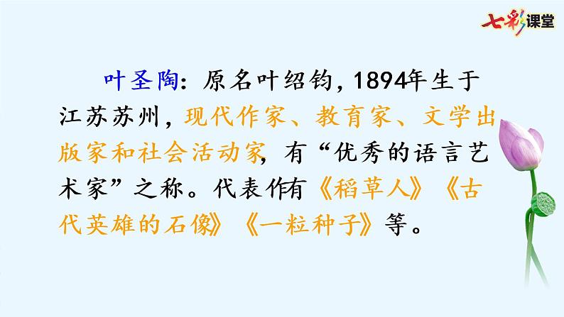 叶圣陶:原名叶绍钧,1894年生于江苏苏州,现代作家、教育家、文学出版家和社会活动家,有“优秀的语言艺术家”之称。代表作有《稻草人》《古代英雄的石像》《一粒种子》等。