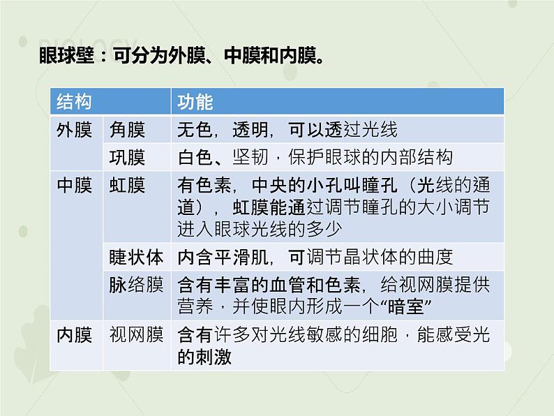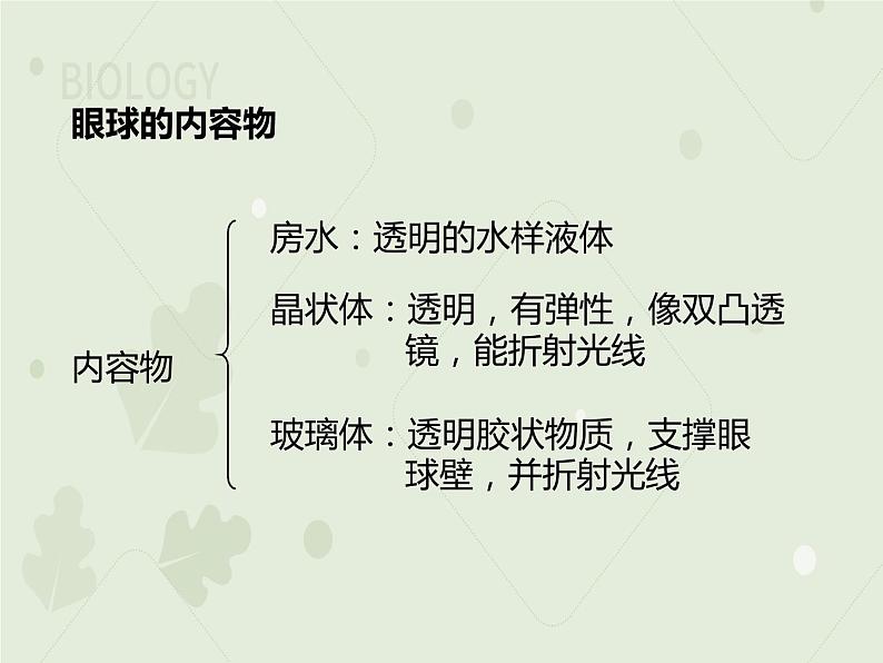 展开第1节 人体对外界环境的感知第6章 人体生命活动的调节假如你在用餐,你会看到饭菜的形状和颜色,闻到饭莱的气味,尝到饭菜的味道,手指感觉到馒头的温热,当然,你还会听到同学的谈话。你能说出上述五种感觉分别来自身体的哪个部位吗?这些感觉对你完成就餐有什么意义?这五种感觉分别来自眼、鼻、舌、皮肤和耳。这些感觉能使我们感受到饭菜的色、香、味,享受用餐过程,并使我们全面、准确地感知吃饭时环境的变化,及时作出判断和反应。感受器(1)概念:感受外界刺激的结构。有些感受器比较简单,如皮肤里的感觉神经末梢。(2)功能:人体的各种感觉是靠分布在身体不同部位的感受器获取的。感觉器官(1)概念:带有附属结构的感受器。(2)举例①眼是视觉器官,据科学家统计,在我们从外界获得的信息中,大多是来自视觉。②耳是听觉器官,通过听觉接受的各种信息的数量仅次于视觉,居第二位。一、眼和视觉视觉错误的图片眼球是眼的最主要结构,视觉的形成与眼球有关。人的眼球近似球眼球的结构体,由眼球壁和眼球的内容物构成。眼球的结构眼球壁:可分为外膜、中膜和内膜。眼球的内容物内容物房水:透明的水样液体晶状体:透明,有弹性,像双凸透 镜,能折射光线玻璃体:透明胶状物质,支撑眼 球壁,并折射光线视觉形成的过程外界光线→角膜→瞳孔→晶状体→玻璃体→视网膜→视神经→大脑皮层视觉中枢形成视觉瞳孔变化明亮黑暗 瞳孔小瞳孔大人的瞳孔的大小也会随光线的强弱而调节。瞳孔可以控制进入眼睛的光线的量。二、近视及其预防近视的原因:晶状体曲度过大(使形成的物像拉近,不能落在视网膜上)眼球前后径过长(使物像落在视网膜前面)成像特点:在视网膜前方成像症状:看不清楚远处的物体矫正方法:佩戴凹透镜近视眼的预防“三要”读写姿势要正确,眼与书的距离要在33厘米左右。看书、看电视或使用电脑1小时后要休息一下,要远眺几分钟。要定期检查视力,认真做眼保健操。讲授新课 “四不看”不在直射的强光下看书不在光线暗的地方看书不躺卧看书不走路看书讲授新课三、耳和听觉 观察课本83页图片,与小组同学完成讨论。假如人失去听觉,以下场面各会出现什么情况?请列举几个说明耳和听觉重要性的其他实例。人若失去听觉,就听不到汽车鸣笛,无法迅速避让,易发生危险;听不到电话铃声,无法接听电话;听不到同学的讨论,很难积极参与交流;听不到音乐,不能按节拍做广播操,不能使动作整齐划一。人若失去听觉,就无法欣赏优美的音乐,得不到心灵的陶冶;听不到教师讲课,无法正常上课。耳的基本结构耳的结构外耳中耳内耳耳 郭外耳道鼓 膜听小骨鼓 室半规管前 庭耳 蜗收集声波传导声波产生振动传导振动能感受头部位置变动的情况,与维持身体平衡有关有听觉感受器,感受刺激产生神经冲动耳的结构和功能有咽鼓管,与咽部相通,使鼓膜内外气压平衡前庭和半规管虽然是内耳的结构,但是与产生听觉无关。晕车、晕船与前庭和半规管有关。听觉的形成听小骨外界的声波耳廓大脑皮层的听觉中枢听神经耳蜗鼓膜外耳道耳的卫生保健(1)减少和消除噪声(2)不要用尖锐的器物挖耳朵,以免戳伤外耳道或鼓膜。(3)遇到巨大声响时,迅速张开口,使咽鼓管张开,或闭嘴、堵耳,以保持鼓膜两侧的大气压力平衡。(4)鼻咽部有炎症时,要及时治疗,避免引起中耳炎。入外耳道,避免外耳道感染。中耳炎的诱因及预防由于咽鼓管连通咽部和中耳,因此,当鼻、咽、喉部位有炎症时,病菌可能会通过咽鼓管进入中耳,引起中耳炎。此时,除了积极进行治疗外,还可用食盐水漱口,保持口腔清洁。练一练1.在视觉形成过程中,能把光刺激转变为神经冲动的结构是( )A.晶状体 B.角膜 C.视网膜 D.视神经2.视觉健康困扰着现代人的生活,青少年长时间近距离看书或沉迷于手机游戏都容易形成近视,通过屏蔽蓝光可降低电子屏幕辐射对眼球成像部位的影响,导致近视的主要结构和形成物像的部位依次是( )A.晶状体 视网膜 B.晶状体 视觉中枢 C.玻璃体 大脑皮层 D.睫状体 脉络膜CA3.一只蜜蜂嗡嗡地朝你迎面飞来,你将会听到、看到。视觉和听觉形成的部位分别是( )A.视网膜、鼓膜 B.晶状体、耳蜗 C.视网膜、耳蜗 D.大脑皮层、大脑皮层4.如图为耳的结构示意图。当我们遇到巨大声响时,应迅速张开口,或闭嘴、堵耳,以避免损伤耳的( )A.① B.② C.③ D.④DB5.司机看见红灯就会停车,“红灯”的光线进入眼球的先后顺序是( )A.角膜→瞳孔→晶状体→玻璃体→视网膜 B.瞳孔→角膜→玻璃体→晶状体→视网膜C.角膜→瞳孔→玻璃体→晶状体→视网膜 D.瞳孔→角膜→晶状体→玻璃体→视网膜A6.“风声、雨声、读书声,声声人耳”。下列哪项是听觉形成的过程( )①外界声波 ②外耳道 ③听小骨 ④鼓膜 ⑤耳蜗 ⑥听神经 ⑦形成听觉 ⑧听觉中枢A.①→②→③→④→⑥→⑤→⑦→⑧ B.①→②→③→④→⑤→⑥→⑦→⑧ C.①→②→③→④→⑥→⑦→⑤→⑧ D.①→②→④→③→⑤→⑥→⑧→⑦D
