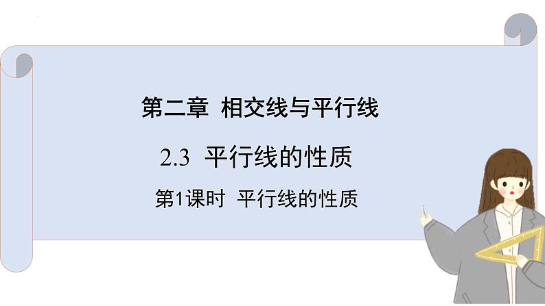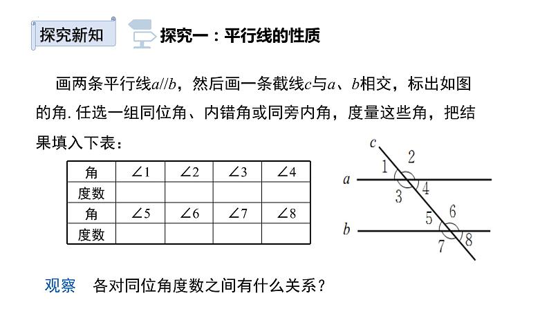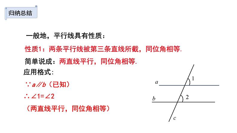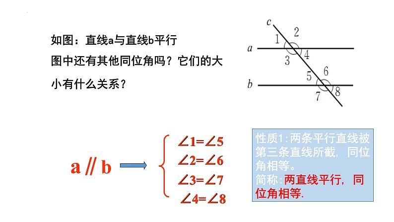 性质1:两条平行直线被第三条直线所截, 同位角相等。简称:两直线平行, 同位角相等.