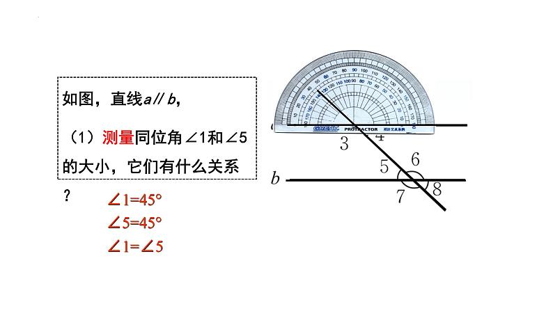 如图,直线a∥b,(1)测量同位角∠1和∠5的大小,它们有什么关系?