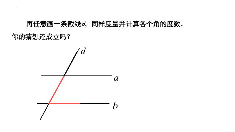 再任意画一条截线d,同样度量并计算各个角的度数,你的猜想还成立吗?