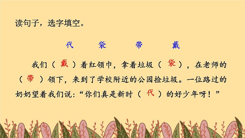 代 袋 带 戴 我们( )着红领巾,拿着垃圾( ),在老师的( )领下,来到了学校附近的公园捡垃圾。一位路过的奶奶望着我们说:“你们真是新时( )的好少年呀!”