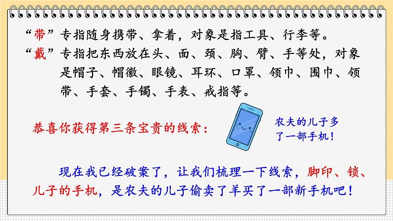 现在我已经破案了,让我们梳理一下线索,脚印、锁、儿子的手机,是农夫的儿子偷卖了羊买了一部新手机吧!