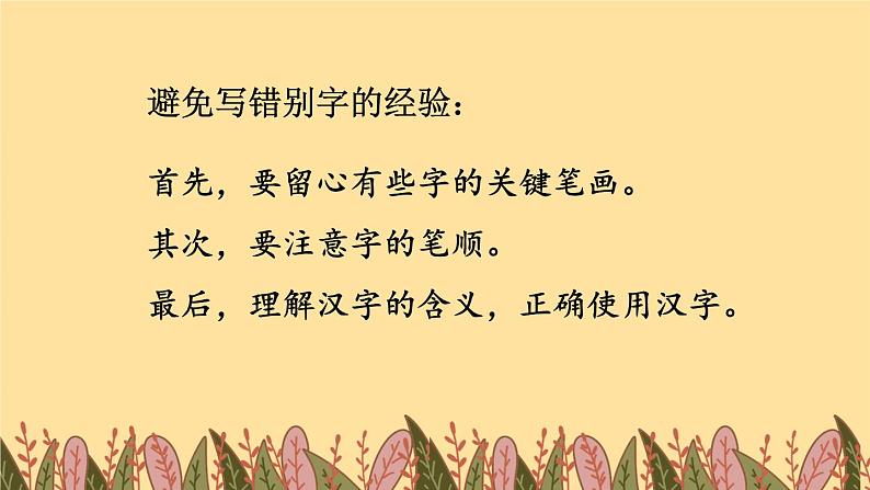 首先,要留心有些字的关键笔画。其次,要注意字的笔顺。最后,理解汉字的含义,正确使用汉字。