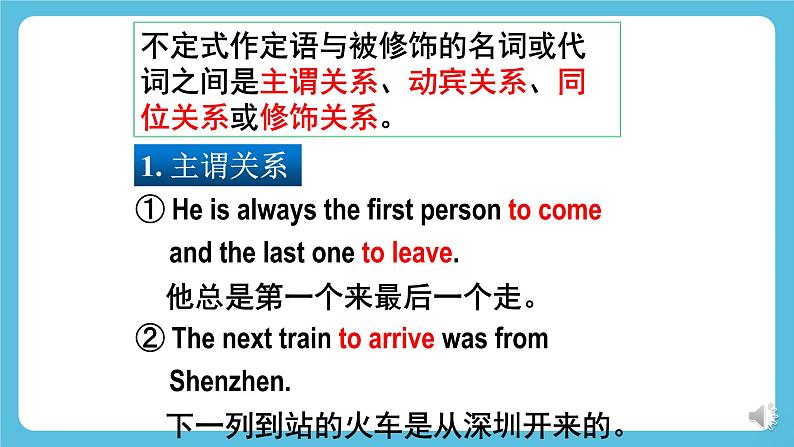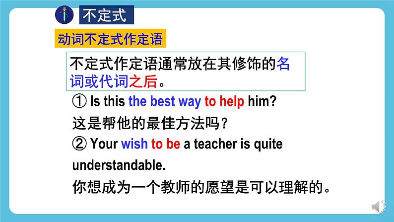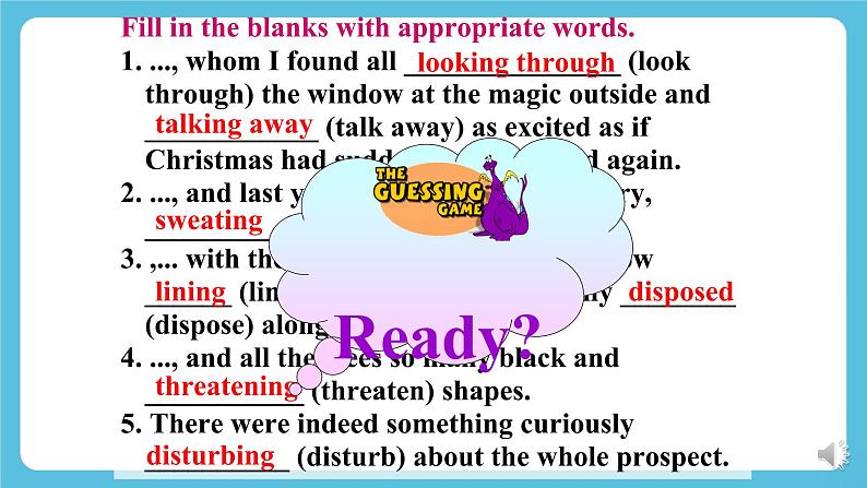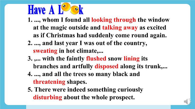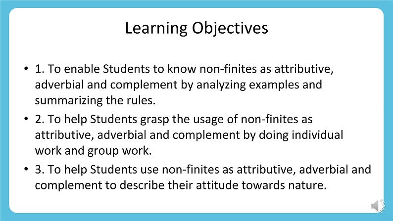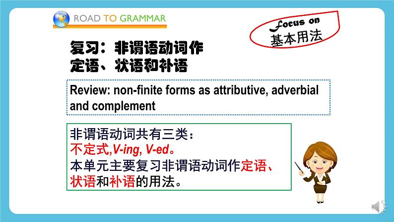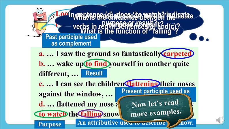 外研版高中英语新教材选修第三册Unit 6 Nature in wordsUsing languageLearning Objectives1. To enable Students to know non-finites as attributive, adverbial and complement by analyzing examples and summarizing the rules.2. To help Students grasp the usage of non-finites as attributive, adverbial and complement by doing individual work and group work.3. To help Students use non-finites as attributive, adverbial and complement to describe their attitude towards nature.a. … I saw the ground so fantastically carpeted.b. … wake up to find yourself in another quite different, …c. … I can see the children flattening their noses against the window, …d. … flattened my nose against the cold window to watch the falling snow…What is the difference between the verbs in red in sentences(a) and(c)?In sentence (b), does “to find” indicate purpose or result?Past participle used as complementPresent participle used as complementPurposeResultAn attributive used to describe the snow.In sentence (d), does “to watch” indicate purpose or result? What is the function of “falling”?1. ..., whom I found all looking through the window at the magic outside and talking away as excited as if Christmas had suddenly come round again.2. ..., and last year I was out of the country, sweating in hot climate,...3. ,... with the faintly flushed snow lining its branches and artfully disposed along its trunk,...4. ..., and all the trees so many black and threatening shapes.5. There were indeed something curiously disturbing about the whole prospect.1. ..., whom I found all _______________ (look through) the window at the magic outside and ____________ (talk away) as excited as if Christmas had suddenly come round again.2. ..., and last year I was out of the country, _________ (sweat) in hot climate,...3. ,... with the faintly ________ (flush) snow ______ (line) its branches and artfully ________ (dispose) along its trunk,...4. ..., and all the trees so many black and ___________ (threaten) shapes.5. There were indeed something curiously __________ (disturb) about the whole prospect.Fill in the blanks with appropriate words.looking throughtalking awaysweatingflushedliningdisposedthreateninggodisturbing非谓语动词共有三类:不定式,V-ing, V-ed。本单元主要复习非谓语动词作定语、状语和补语的用法。复习:非谓语动词作定语、状语和补语Focus on 基本用法Review: non-finite forms as attributive, adverbial and complement不定式作定语通常放在其修饰的名词或代词之后。① Is this the best way to help him?这是帮他的最佳方法吗?② Your wish to be a teacher is quite understandable. 你想成为一个教师的愿望是可以理解的。 不定式动词不定式作定语1. 主谓关系① He is always the first person to come and the last one to leave. 他总是第一个来最后一个走。② The next train to arrive was from Shenzhen. 下一列到站的火车是从深圳开来的。不定式作定语与被修饰的名词或代词之间是主谓关系、动宾关系、同位关系或修饰关系。2. 动宾关系① The teacher left us a lot of problems to solve. 老师给我们留了很多题要解答。② Please give me something to drink. 请给我点喝的。③ He wanted to find a new house to live in. 他想找个新房子住。当不定式作定语,且与被修饰的词语有逻辑上的动宾关系时,不定式动词应该是及物动词;若不定式动词为不及物动词,则该动词必须与介词连用,组成及物的动词短语。3. 同位关系① He broke his promise to write to his parents regularly. 他没有遵守定期给父母写信的承诺。② We students should have the courage to face any difficulty. 我们学生应该有面对任何困难的勇气。4. 修饰关系① Now it is time to begin our class. 现在是上课的时间了。② I need somewhere to take a nap. 我需要一个地方打个盹。①He came here to attend an important meeting. ②Sam was very surprised to hear the news.③He went home to find his old friend George waiting for him. 目的原因结果动词不定式用作状语时,可以表示谓语动作发生的原因、目的、结果。动词不定式作状语① I'd like you to keep everything tidy. 我希望你能保持每样东西都整洁。② The teacher asked us to finish the work today. 老师要我们今天完成工作。③ Can you remind me to phone Ann tomorrow? 你能提醒我明天给安打个电话吗?动词不定式作宾语补足语带to的不定式verb + object + to infinitivewant ask help would like would love expect beg mean(=intend) would prefer would hate tell remind force enable teach order warn invite persuade get advise recommend encourage allow permit forbid(1) Can you help me ____________ English?你可以帮助我学英语吗?(2) I wish you could persuade her___________________.我希望你可以说服她仔细考虑一下。to learnto think it over ①Her parents wouldn’t let her go out alone.她父母不会让她独自出门。②The boss made the workers work 14 hours a day.老板让工人们每天工作14小时。③The teacher often has his students read aloud in class.老师经常让他的学生在教室里大声读。1) 用于使役动词let、make和have后面不带to的不定式2) 用于感官动词feel, hear, see和watch等后面①I felt something crawl up my arm.我觉得有个东西顺着手臂往上爬。②Did you hear him go out?你听到他出去了吗?③They saw the boy fall suddenly from the tree.他们看见那小男孩突然从树上跌下来。④They watched the bus disappear into the distance.他们注视着公共汽车消失在远方。drinking water =a walking stick =a reading room =a writing desk =tiring music = water for drinking 饮用水a stick for walking 手杖a room for reading 阅览室a desk for writing 写字台music that is tiring 烦人的音乐1. 单个的动词-ing形式作定语位于被修饰名词的前面,