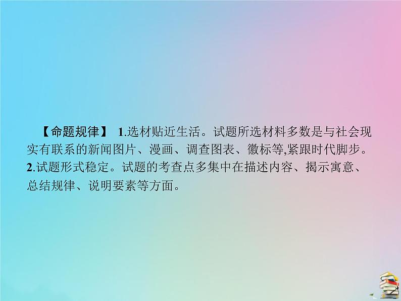 【命题规律】 1.选材贴近生活。试题所选材料多数是与社会现实有联系的新闻图片、漫画、调查图表、徽标等,紧跟时代脚步。2.试题形式稳定。试题的考查点多集中在描述内容、揭示寓意、总结规律、说明要素等方面。