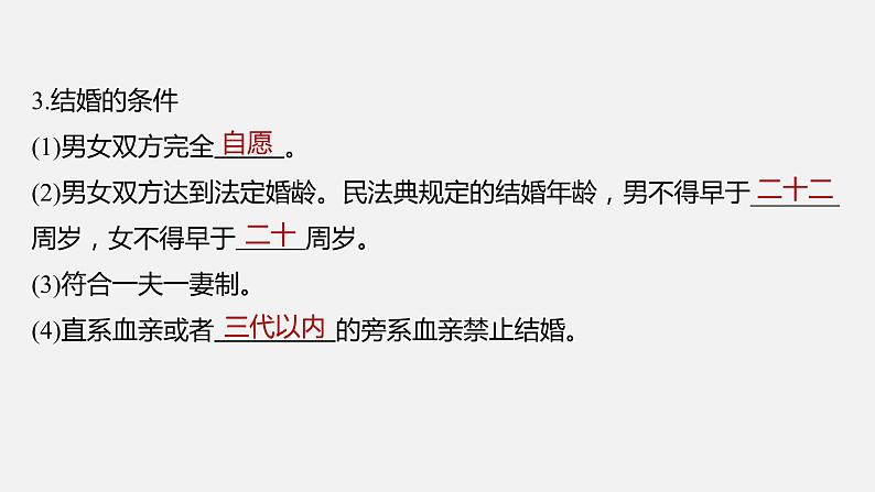 这是一份高中政治 (道德与法治)法律保护下的婚姻图文课件ppt,共47页。PPT课件主要包含了自主学习·新知全解,课堂互动·议题探究,随堂检测·课时达标,结婚自由,男女平等,未成年人,二十二,三代以内,权利义务,婚姻登记等内容,欢迎下载使用。