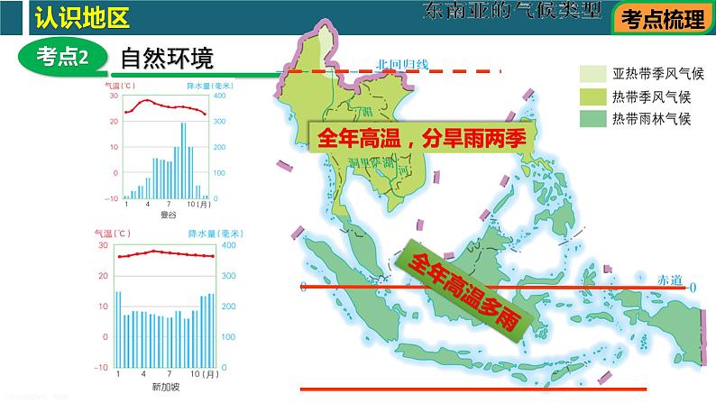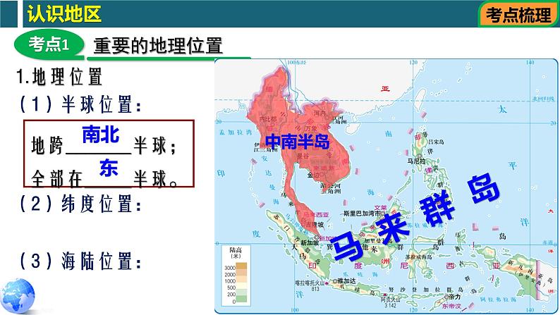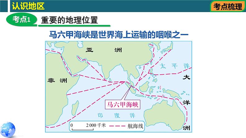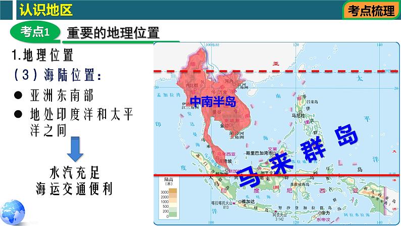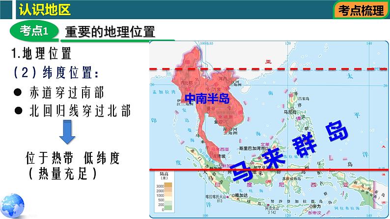 这是一份第六章认识地区(复习课件),共25页。PPT课件主要包含了内容要求,重要的地理位置,马来群岛,地理位置,2纬度位置,赤道穿过南部,北回归线穿过北部,3海陆位置,亚洲东南部,水汽充足海运交通便利等内容,欢迎下载使用。