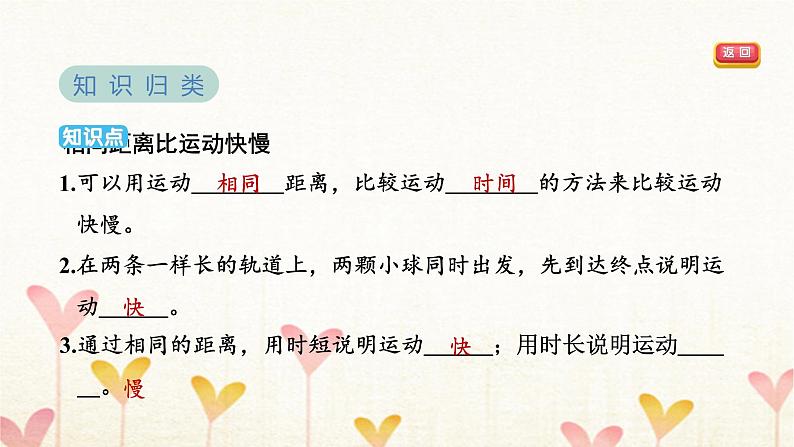 3.通过相同的距离,用时短说明运动 快 ;用时长说明运动 慢 。