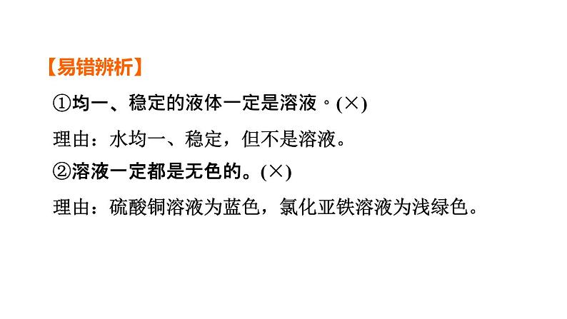 ①均一、稳定的液体一定是溶液。(×)理由:水均一、稳定,但不是溶液。②溶液一定都是无色的。(×)理由:硫酸铜溶液为蓝色,氯化亚铁溶液为浅绿色。
