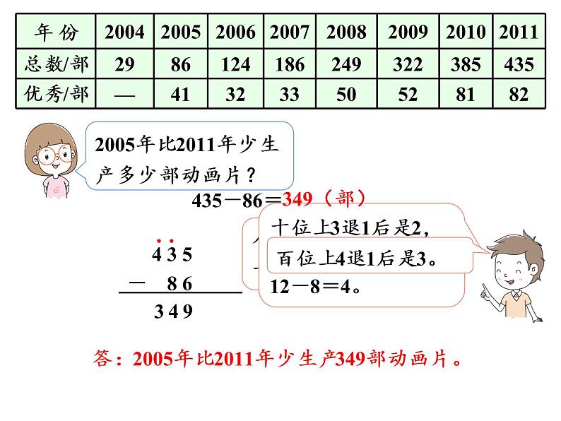 答:2005年比2011年少生产349部动画片。