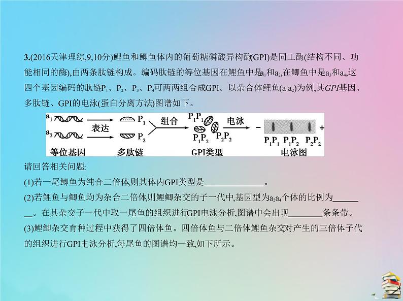 3.(2016天津理综,9,10分)鲤鱼和鲫鱼体内的葡萄糖磷酸异构酶(GPI)是同工酶(结构不同、功能相同的酶),由两条肽链构成。编码肽链的等位基因在鲤鱼中是a1和a2,在鲫鱼中是a3和a4,这四个基因编码的肽链P1、P2、P3、P4可两两组合成GPI。以杂合体鲤鱼(a1a2)为例,其GPI基因、多肽链、GPI的电泳(蛋白分离方法)图谱如下。 请回答相关问题:(1)若一尾鲫鱼为纯合二倍体,则其体内GPI类型是 。(2)若鲤鱼与鲫鱼均为杂合二倍体,则鲤鲫杂交的子一代中,基因型为a2a4个体的比例为 。在其杂交子一代中取一尾鱼的组织进行GPI电泳分析,图谱中会出现 条条带。(3)鲤鲫杂交育种过程中获得了四倍体鱼。四倍体鱼与二倍体鲤鱼杂交,对产生的三倍体子代的组织进行GPI电泳分析,每尾鱼的图谱均一致,如下所示。