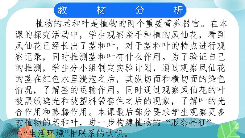 茎和叶教材分析学情分析教学目标教学重难点教材处理教学过程与教学策略教学效果与教学反思板书设计 植物的茎和叶是植物的两个重要营养器官。在本课的探究活动中,学生观察亲手种植的凤仙花,看到凤仙花已经长出了茎和叶,对于茎和叶的特点进行观察记录,同时推测茎和叶有什么作用。为了验证自己的推测,学生分小组制定实验计划,通过观察凤仙花的茎在红色水里浸泡之后,其纵切面和横切面的染色情况,了解荃的运输作用。同时通过观察凤仙花的叶被黑纸遮光和被塑料袋套住之后的现象,了解叶的光合作用和蒸腾作用。本课最后部分要求学生观察更多的植物的茎和叶,进一步构建植物的 “形态特征” 与“生活环境”相联系的认识。学情分析通过前面几课的学习和种植体验,四年级的学生对于植物的结构和生长变化已有了基础性的认识。他们初步了解了种植植物的方式,也知道植物的种子发芽会先长出了根,后长出茎和叶,并在此过程中学会了对生长中的植物进行观察、记录。那么植物的茎和叶对植物生存有什么作用呢?又该如何验证推测?除凤仙花外,其他形态茎和叶的植物是怎么适应环境的,同样这也是四年级学生非常乐于探究的问题,通过探究构建植物的 “形态特征”与“生活环境” 相联系的认识,借此培养学生善于观察的习惯,并且提高他们的探究能力。科学概念目标 茎和叶是植物体的一部分;不同环境中植物的茎、叶外部形态不同;茎具有支撑植物以及运输水分和养料的作用;叶能吸收阳光制造养料维持植物生存;叶能蒸腾水分调节体温维持植物正常的生命活动。科学探究目标 能基于观察描述凤仙花叶在茎上分布的样子,发现其生长的规律;能够基于观察及已有认知推测荃与叶的功能;能够利用实验收集证据验证推测,得出结论。科学态度目标 对茎与叶的作用表现出探究的兴趣;尊重事实,能依据事实调整自己的想法。科学、技术、社会与环境目标意识到环境影响植物生长,具有保护环境的意识。重点:茎具有支撑植物以及运输水分和养料的作用;叶能吸收阳光制造养料维持植物生存;叶能蒸腾水分调节体温维持植物正常的生命活动。难点:能够利用实验手机证据验证推理。在科学教学中,教师通过语言描述、实物演示、知识渲染等手段创设课堂的教学情景,小学生们大都具有很强的好奇心,但自制力和理解力相对较差,通过丰富的情感体验和社会实践,使学生大胆表现自己认识世界,我尝试采用如下教学法:(1)想象法:通过教师巧妙的介入,引导学生在大自然中感知植物的特点。(2)表现法:通过感知,使学生产生强烈亲身体验和浓厚的学习兴趣,大胆的表现对事物的了解(3)实践法:通过教师有效的引导和亲身的体验,让学生通过感情去亲身实践。(4)探究法 激发学生的思维活动,让学生自主学习,主动探究,充分发挥学生的主动性和积极性,在实践生活中更好的去体验。 本课在学法上主要采用了尝试学习法、对比学习法和小组合作学习法。首先让学生尝试想象大自然中各种各样的植物,然后小组活动、最后通过"讨论交流"和"亲身体验"相结合的学习方法,最终解决问题。从而促进学生主动积极地参与练习,提高学生学习的自主性。 环节一聚焦:植物长出了茎和叶。(预设5分钟)1了解凤仙花的前期生长。教师播放“种子一一幼苗一一成长的图片,回顾植物的生长变化。2.提问:种子萌发后,植物发生了什么变化?(预设:学生会提到茎和叶)3.提问:茎和叶是什么样的?(预设:茎是直直的、圆柱的,叶长在茎的上面,叶是细长的。)4. 揭示课题,板书“茎和叶”。 环节二探索:茎和叶对植物生存有什么作用?(预设25分钟)(一)观察凤仙花的形态特征[材料准备:每组一盆植物〕1. 提问:我们可以从哪些方面观察茎和叶?(预设:学生回答茎的高度、叶的数量等)2.学生活动-一一观察凤仙花:①测量凤仙花植株的高度;②数一数一株凤仙花上叶片的数量;③从不同角度观察④画出凤仙花叶在茎上分布的样子。教师温馨提示:①将卷尺拉直,测量从地面到茎的最高点距离,不要算叶的高度;②用水彩笔在数过的叶片上做标记 ③在观察叶在茎上的分布时,侧面观察要与植物水平,不要从上侧面和下侧面观察。从上面观察时可以将植物放置在地面上,垂直从上向下看。 ④用画图的方法记录叶片分布,不要求学生写生,只要学生能表示出叶片之问的位置关系即可。3.小组交流汇报:①茎的高度;②叶的数量;③叶在茎上的分布图。 (二)探究茎对植物生存的作用1.茎有什么作用?(预设:茎可以把水运给叶,叶需要阳光,多余的水可以从叶里排除)2.提问:用什么实验能够证明自己的想法?3. 小组讨论:设计实验方案。4. 全班交流讨论。5. 总结实验方案,播放微视频:茎的运输作用。①观察凤仙花的茎②将凤仙花茎横切开,观察茎的横切面。③将凤仙花的茎纵切开,观察茎的纵切面。7. 总结:茎具有输送水分及营养物质的作用。 (三)探究叶对植物生存的作用1.叶有什么作用?(预设:叶需要阳光,多余的水可以从叶里排除。)2.提问:用什么实验能够证明自己的想法?3. 全班交流讨论。4. 总结实验方案,播放微视频:叶的蒸腾作用和光合作用.5. 出示凤仙花的叶。6. 总结:叶具有蒸腾作用和光合作用。 环节三、研讨:叶子分布的原因(预设5分钟)1提问:根据茎和叶的作用,植物的叶子平展且在茎上交叉生长有什么好处?环节四、