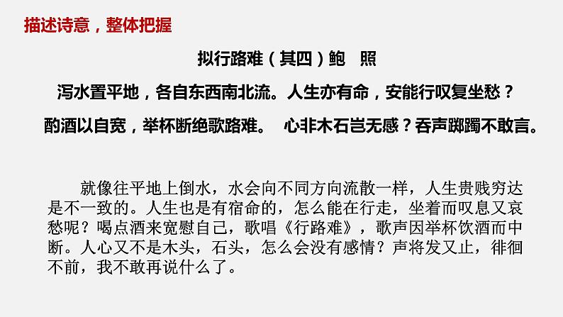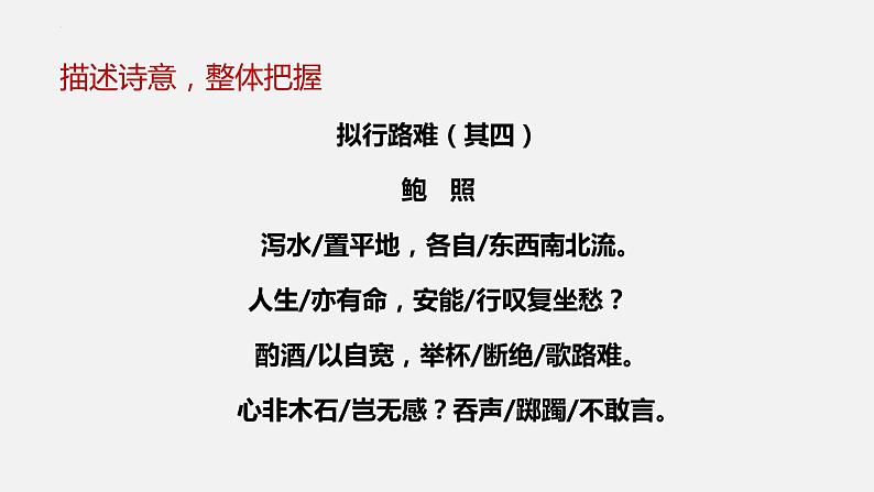 描述诗意,整体把握拟行路难(其四)鲍 照泻水/置平地,各自/东西南北流。人生/亦有命,安能/行叹复坐愁?酌酒/以自宽,举杯/断绝/歌路难。 心非木石/岂无感?吞声/踯躅/不敢言。