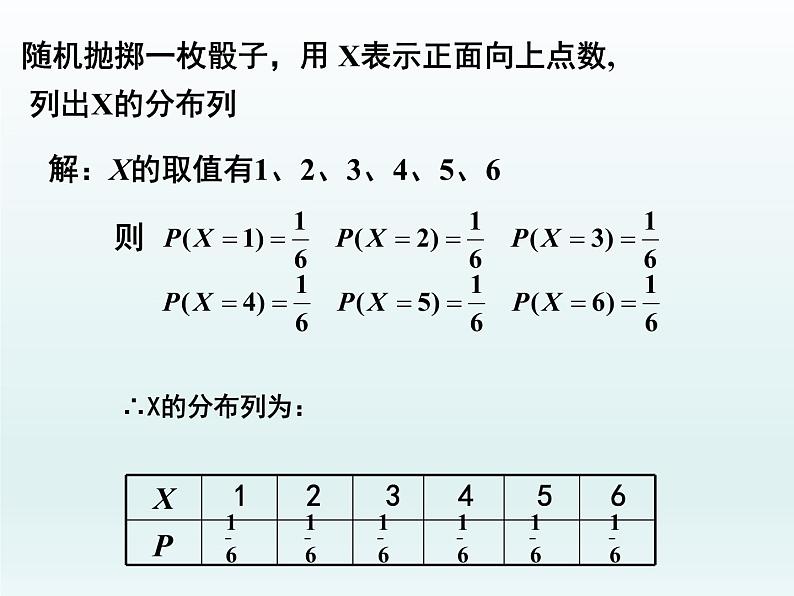随机抛掷一枚骰子,用 X表示正面向上点数, 列出X的分布列