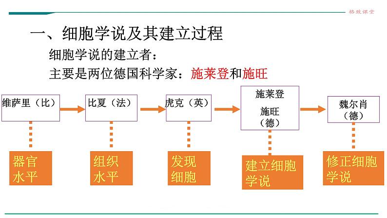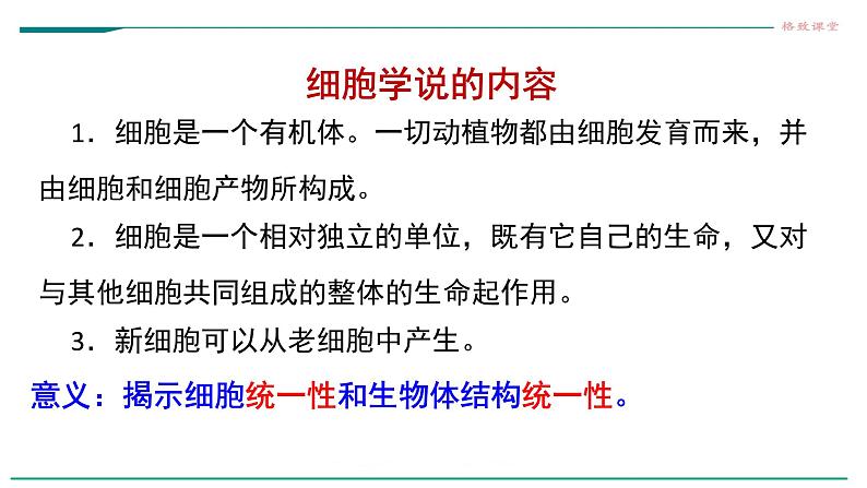 1.细胞是一个有机体。一切动植物都由细胞发育而来,并 由细胞和细胞产物所构成。2.细胞是一个相对独立的单位,既有它自己的生命,又对与其他细胞共同组成的整体的生命起作用。3.新细胞可以从老细胞中产生。