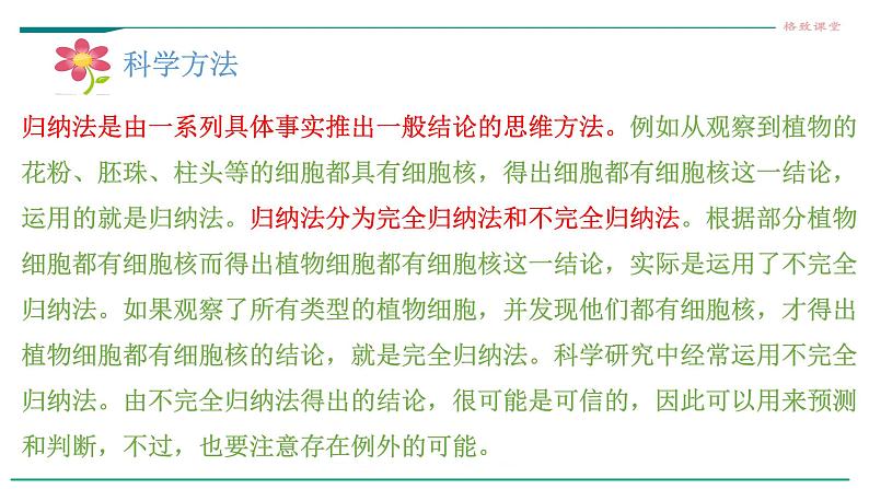 归纳法是由一系列具体事实推出一般结论的思维方法。例如从观察到植物的花粉、胚珠、柱头等的细胞都具有细胞核,得出细胞都有细胞核这一结论,运用的就是归纳法。归纳法分为完全归纳法和不完全归纳法。根据部分植物细胞都有细胞核而得出植物细胞都有细胞核这一结论,实际是运用了不完全归纳法。如果观察了所有类型的植物细胞,并发现他们都有细胞核,才得出植物细胞都有细胞核的结论,就是完全归纳法。科学研究中经常运用不完全归纳法。由不完全归纳法得出的结论,很可能是可信的,因此可以用来预测和判断,不过,也要注意存在例外的可能。