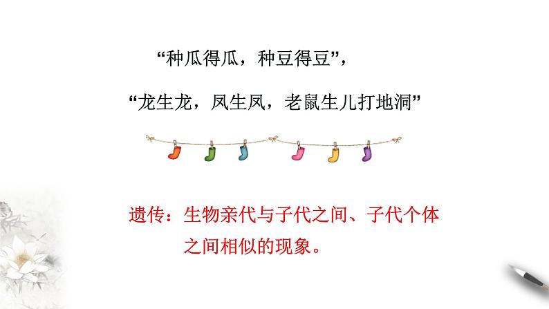 遗传:生物亲代与子代之间、子代个体 之间相似的现象。