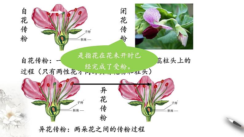 自花传粉:一朵花的花粉落在同一朵花的雌蕊柱头上的过程(只有两性花才同时具有花粉和柱头)