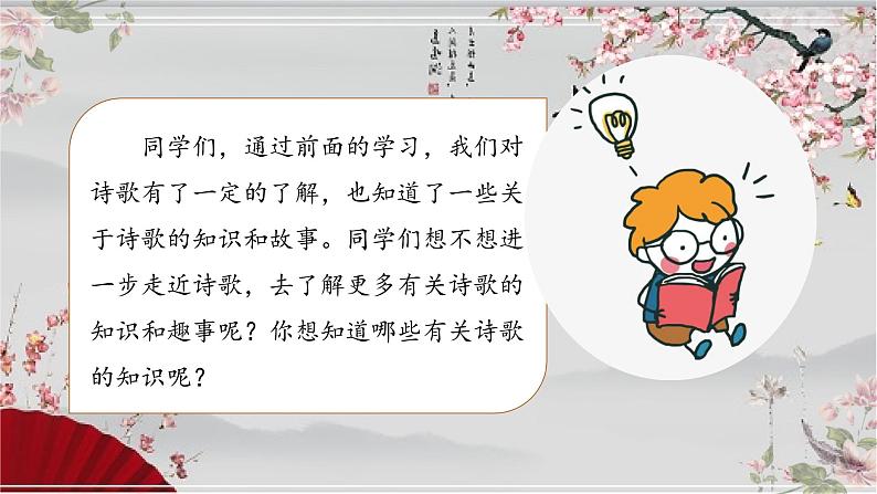 同学们,通过前面的学习,我们对诗歌有了一定的了解,也知道了一些关于诗歌的知识和故事。同学们想不想进一步走近诗歌,去了解更多有关诗歌的知识和趣事呢?你想知道哪些有关诗歌的知识呢?