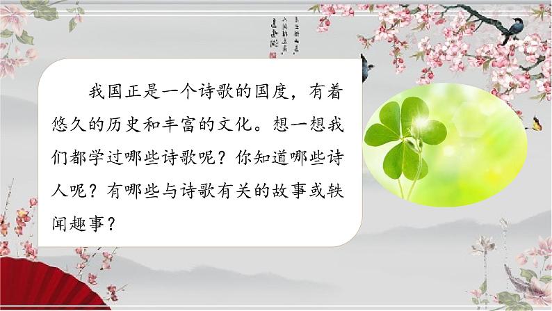 我国正是一个诗歌的国度,有着悠久的历史和丰富的文化。想一想我们都学过哪些诗歌呢?你知道哪些诗人呢?有哪些与诗歌有关的故事或轶闻趣事?