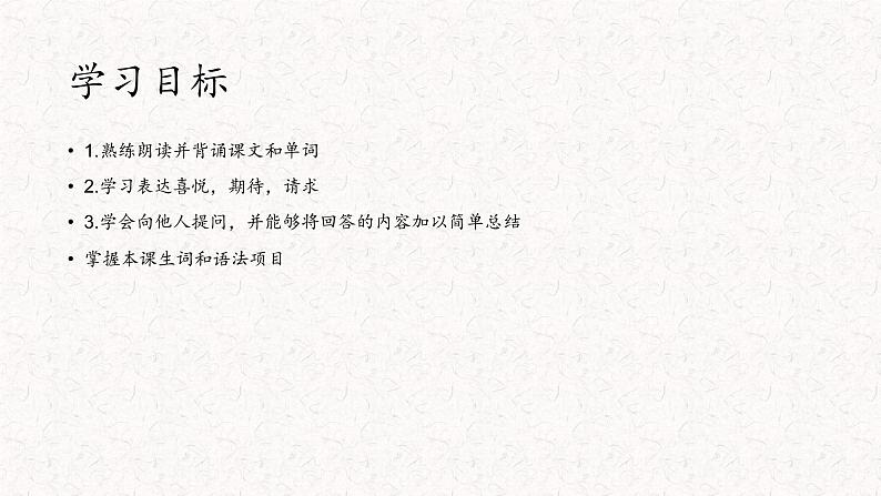 1.熟练朗读并背诵课文和单词2.学习表达喜悦,期待,请求3.学会向他人提问,并能够将回答的内容加以简单总结掌握本课生词和语法项目